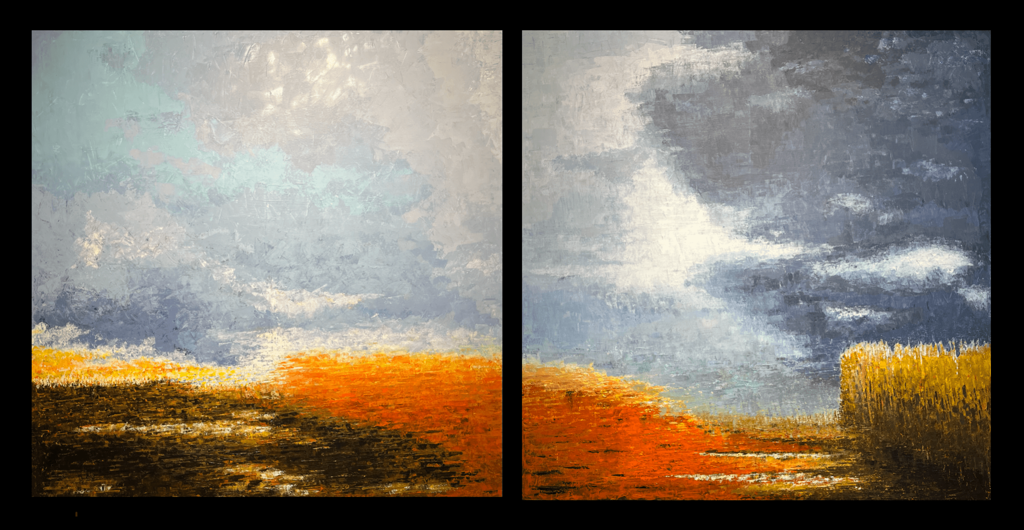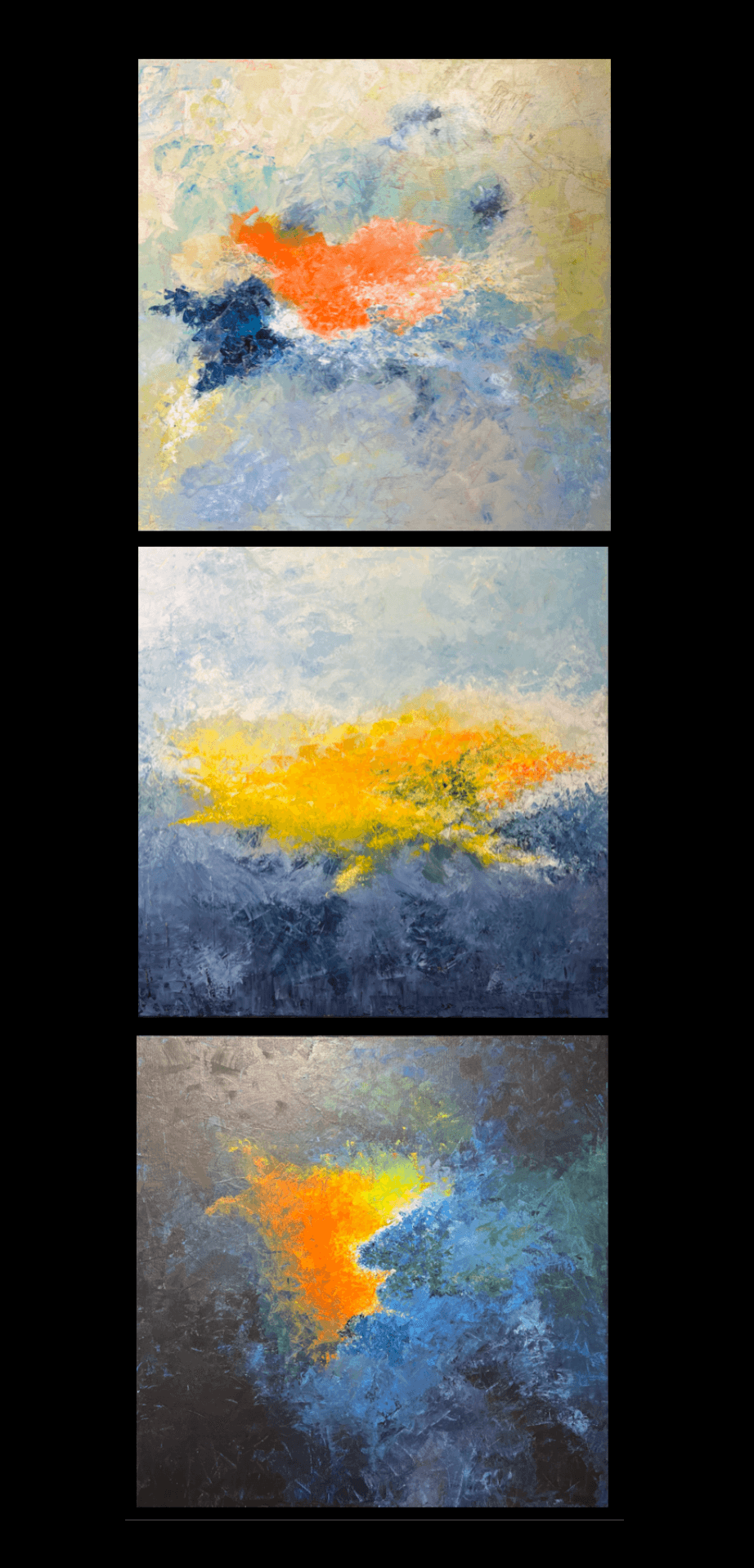 Billederne er malet med akryl. De viste er et par der illustrerer et abstrakt landskab og tre der ønsker at fokusere på kosmos. Mit arbejde med maleri er stærkt inspireret af de tre viste plancher med farveprøver.
